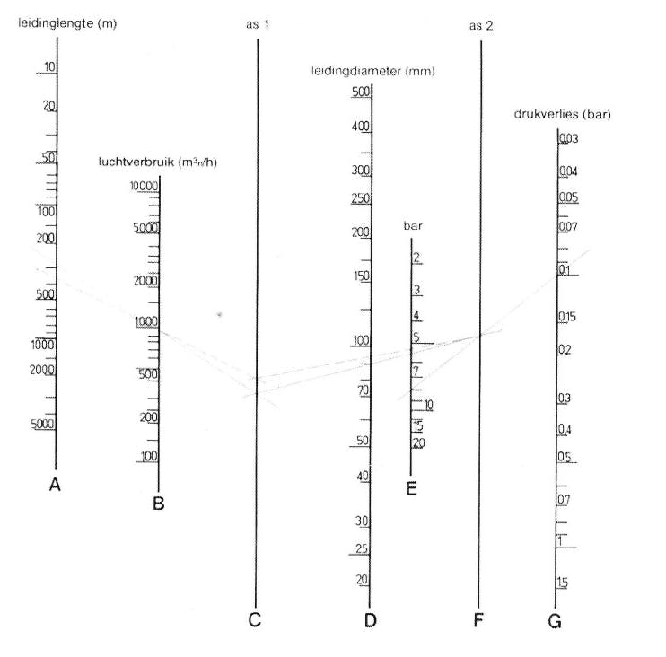 Om het drukverlies in persluchtleidingen te bepalen, bieden bepaalde formules uit de stromingsleer uitkomst. In de praktijk maakt haast niemand gebruik van deze formules, maar bepalen we de buisdiameter of het drukverlies eenvoudiger met een nomogram. (figuur 5)